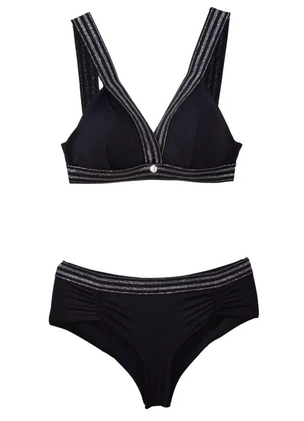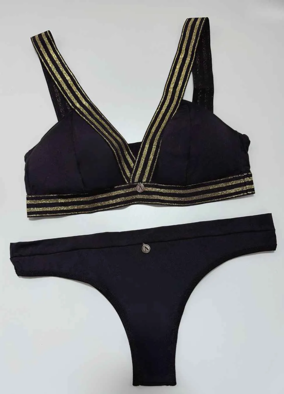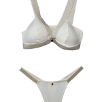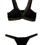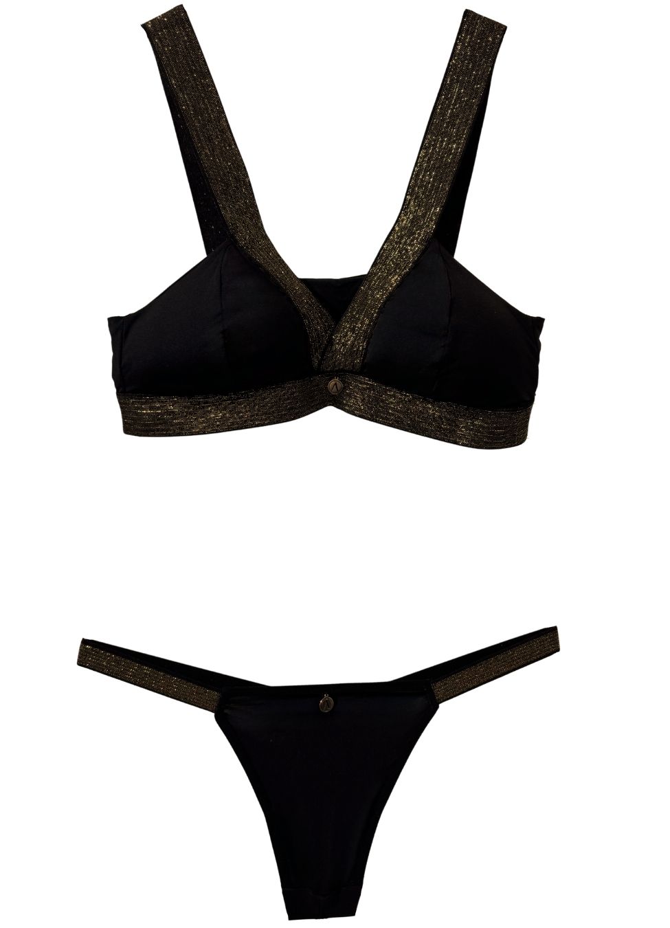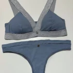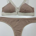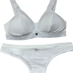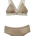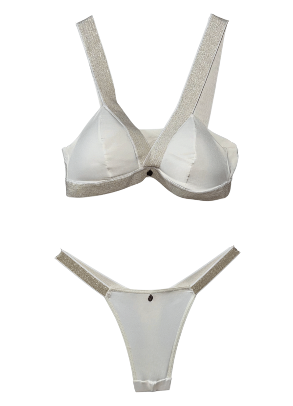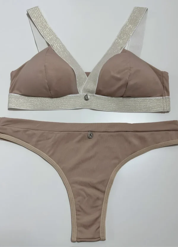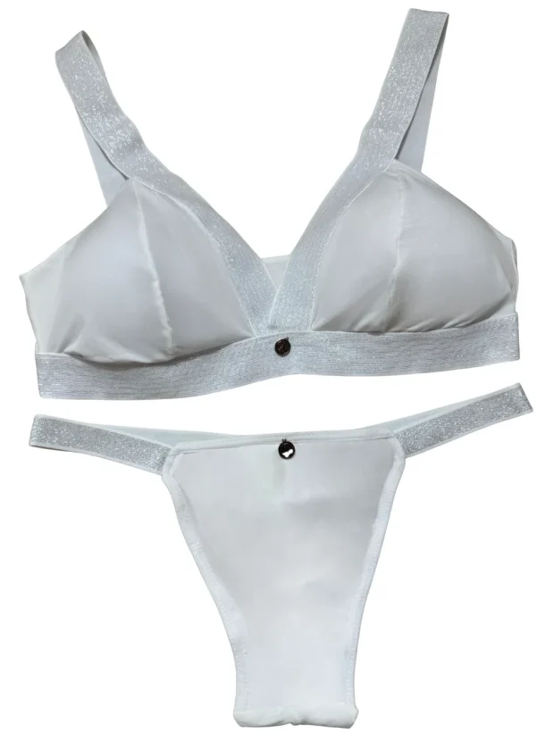 Bralett y panty, fabricados en una tela que mezcla microfibras de poliamida y elastán, garantizando una elasticidad excepcional, adaptándose perfectamente a la forma del cuerpo y proporcionando un soporte cómodo.