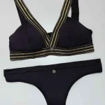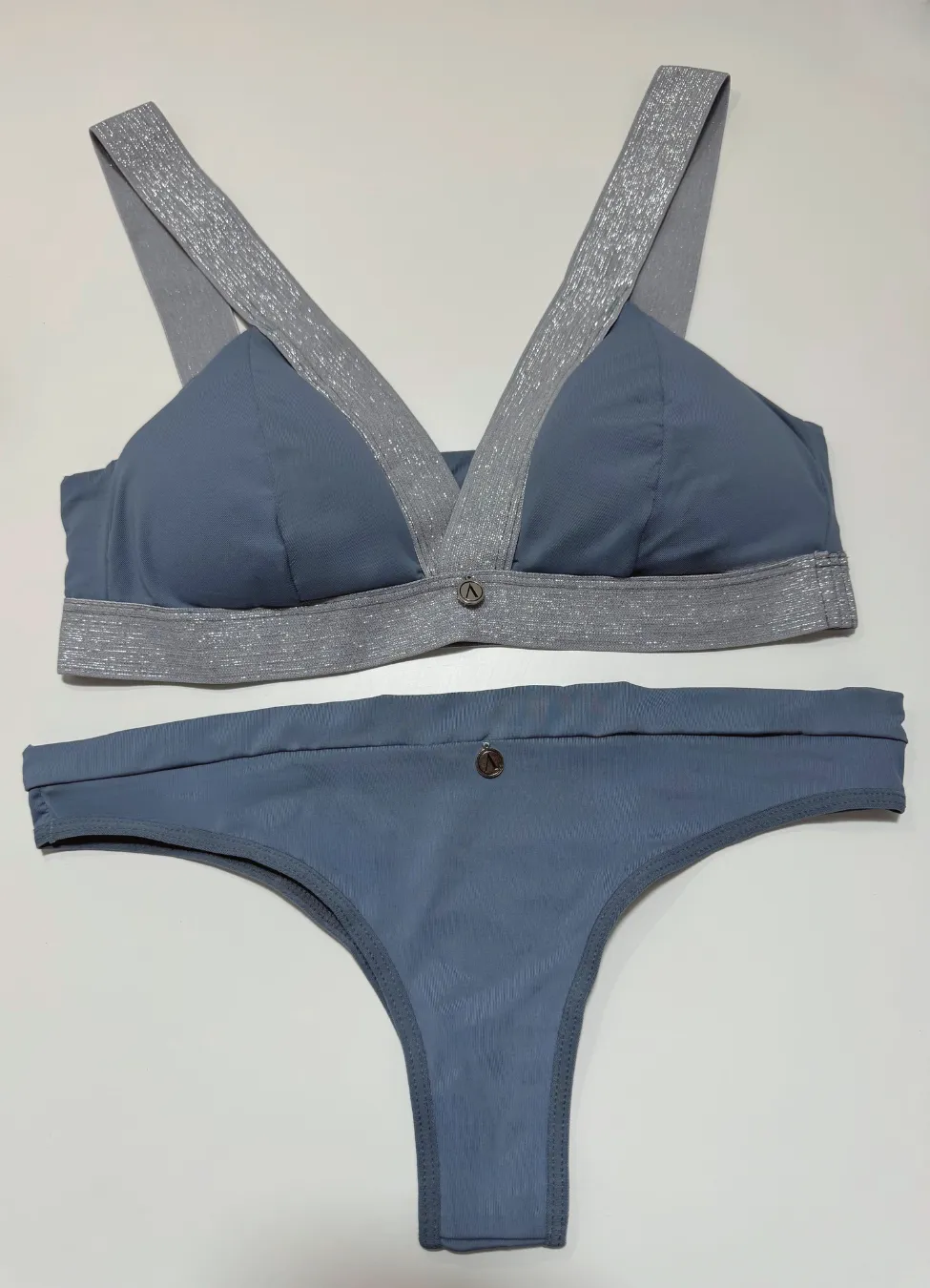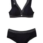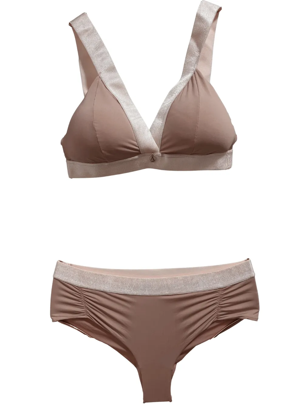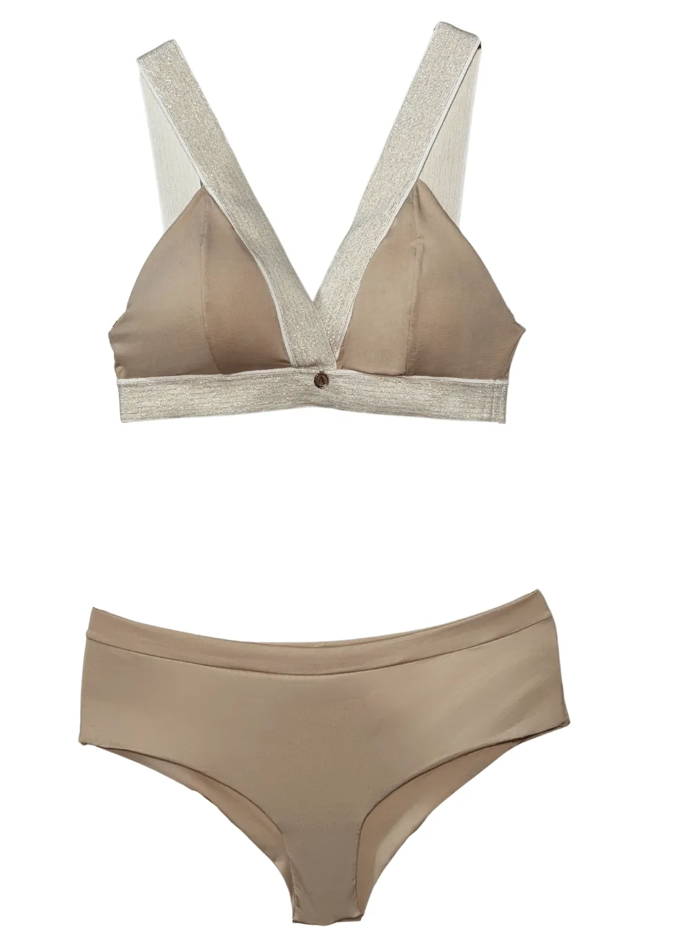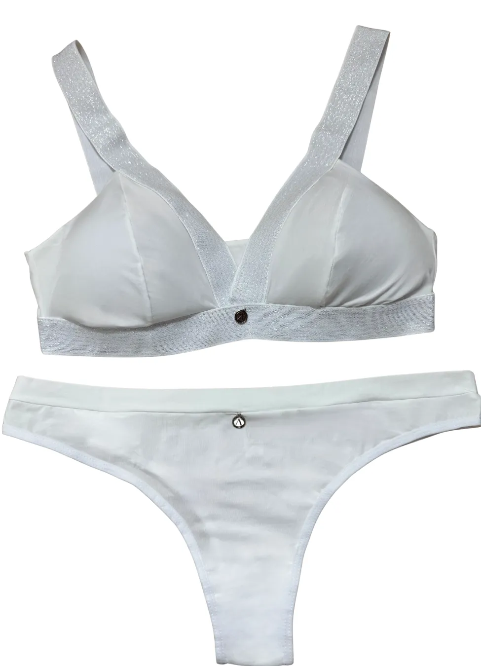 Bralett y panty, fabricados en una tela que mezcla microfibras de poliamida y elastán, garantizando una elasticidad excepcional, adaptándose perfectamente a la forma del cuerpo y proporcionando un soporte cómodo.